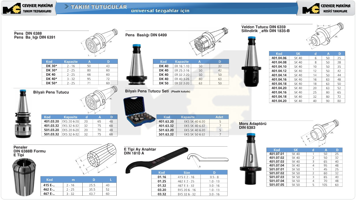 Takım Tutucular Üniversal tezgahlar için takım tutucular: Pens, Pens Başlığı, Veldon Tutucu, Mors Adaptörü, Bilyalı Pens Tutucu, Bilyalı Pens Tutucu Seti